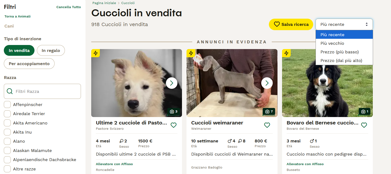 Puoi ordinare i risultati della tua ricerca per data dell'annuncio (più recente, meno recente) o prezzo (più economico, più costoso).