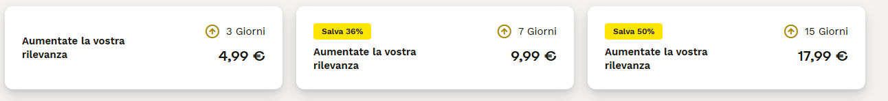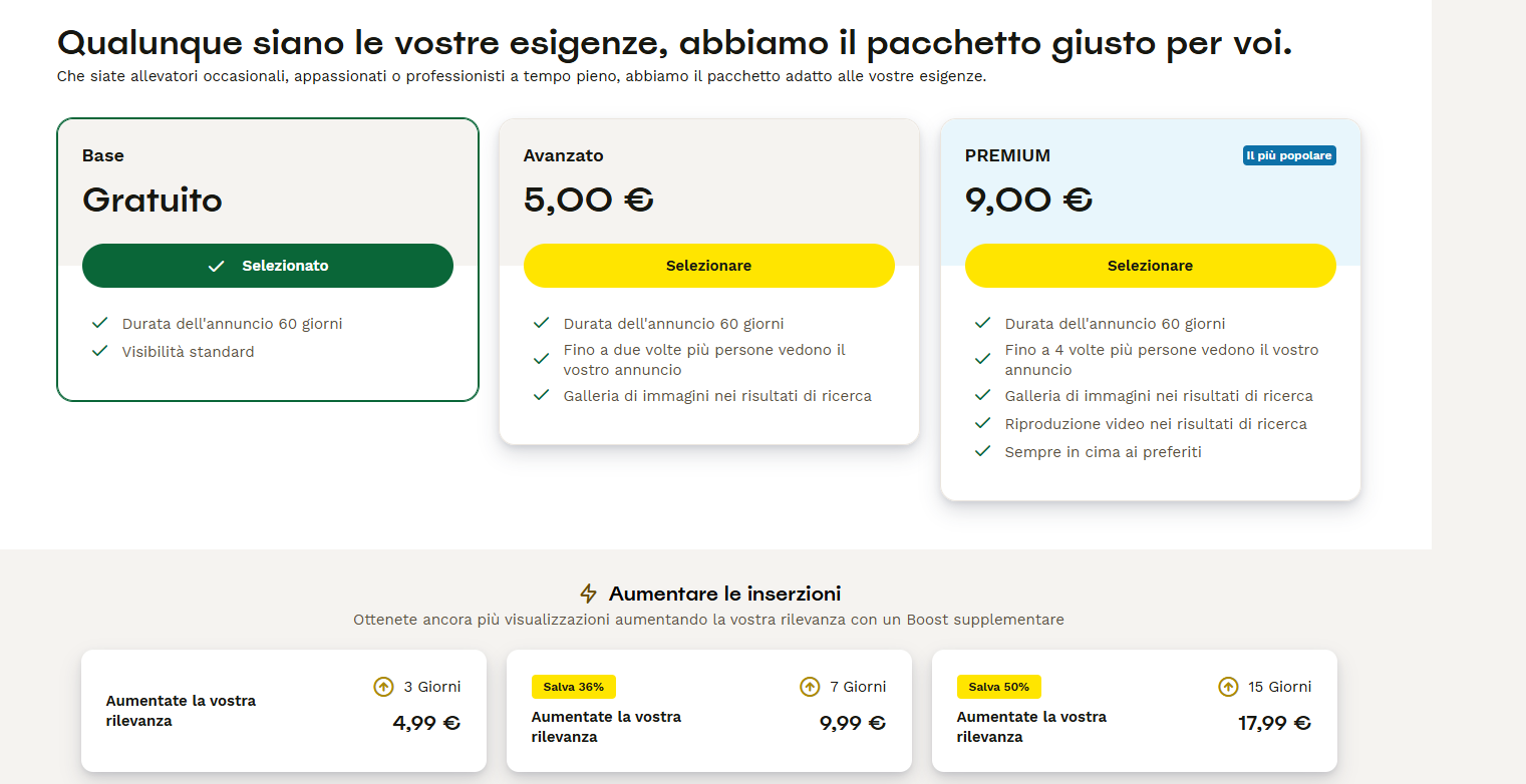 Funzionalità aggiuntive: Scegliendo i piani Avanzato o Premium, tutti i tuoi annunci beneficeranno automaticamente di vantaggi come la galleria immagini nei risultati o una maggiore frequenza di apparizione.