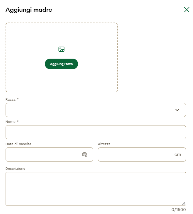 Cliccando su Aggiungi madre o Aggiungi padre, potrai compilare una scheda tecnica dettagliata che include:
